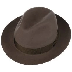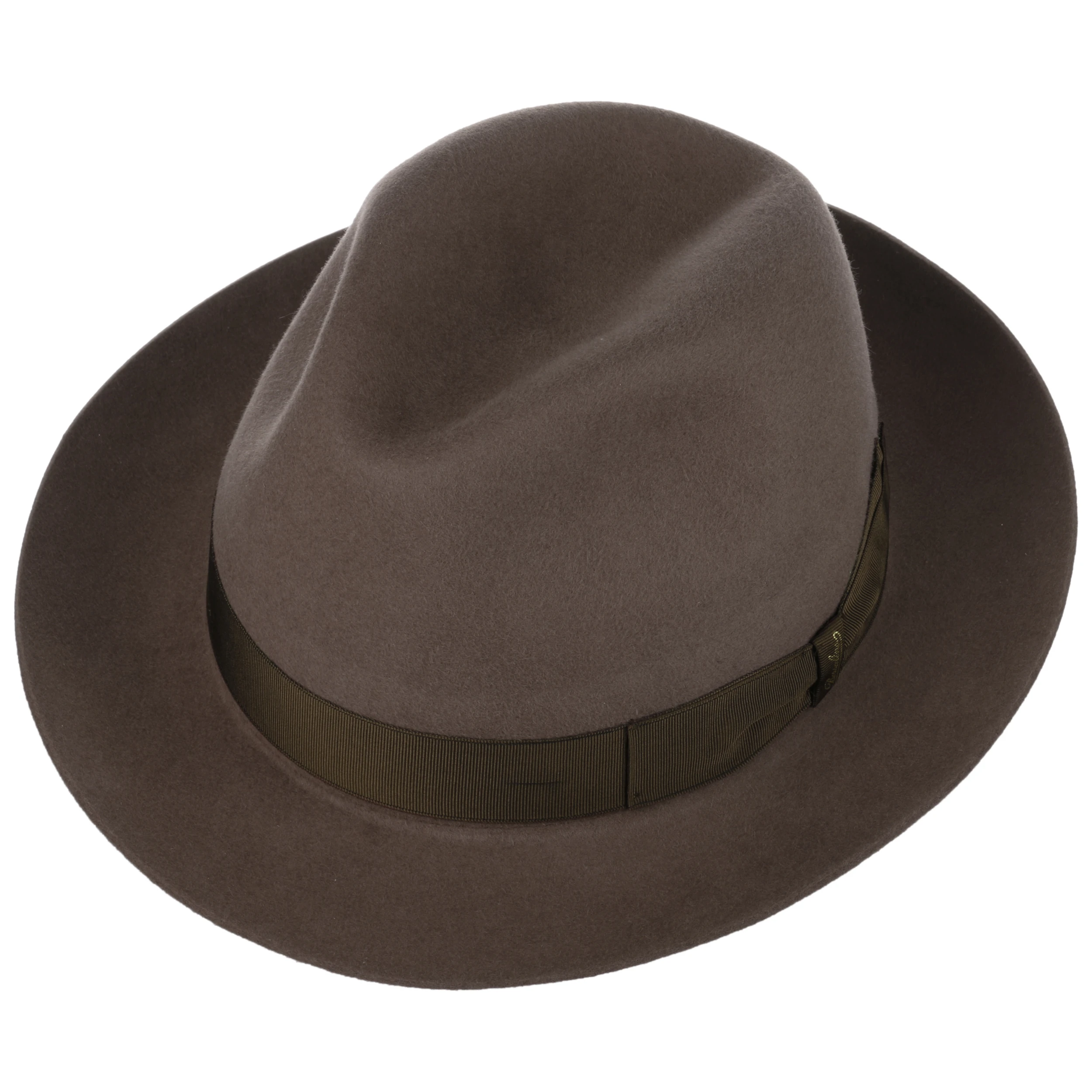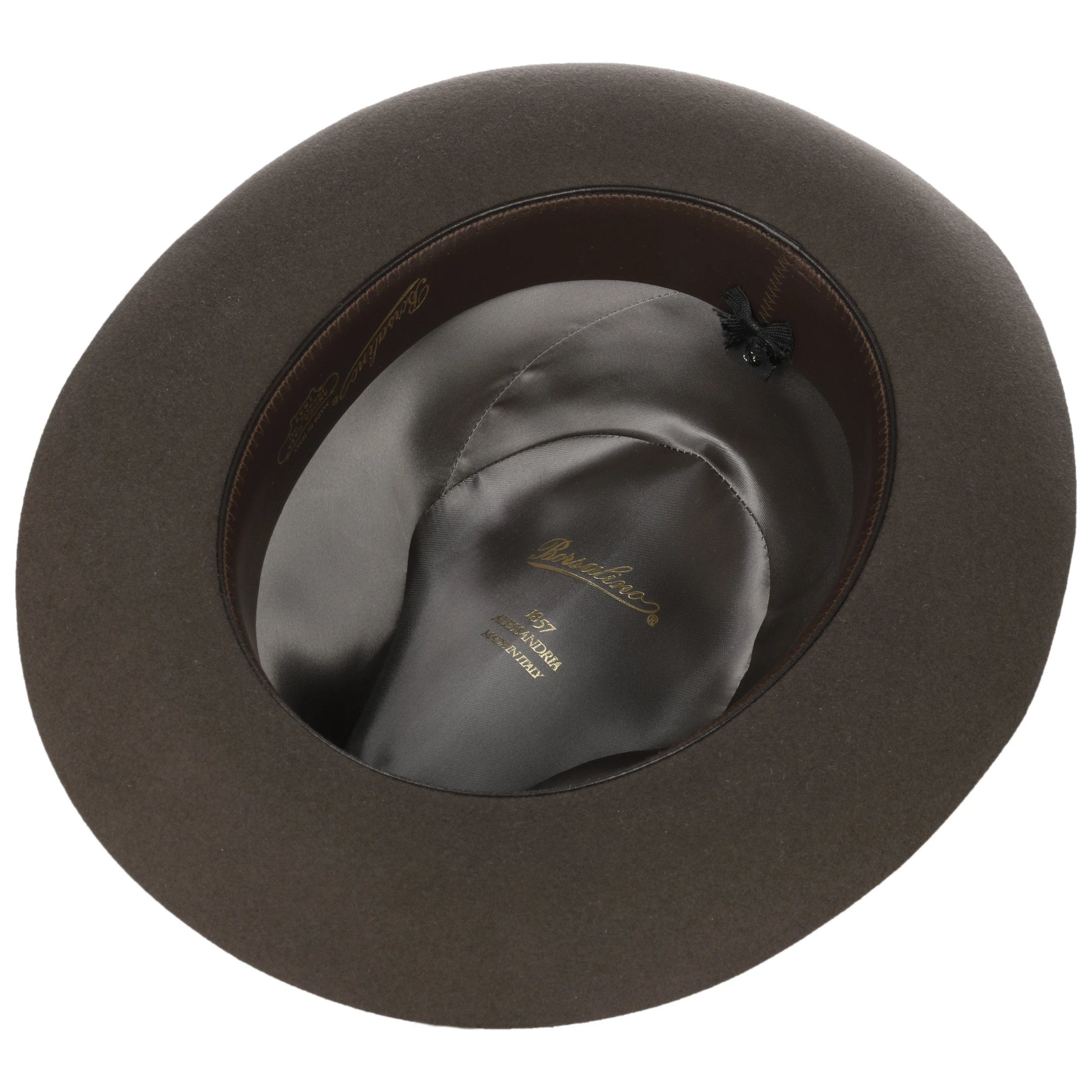Tiefe Kniffe und eine am Rand galant nach oben gewölbte Krempe prägen die schwungvoll anmutende Bogartform der sorgfältig verarbeiteten Kopfbedeckung. 100% erlesenes Haarfilz vom Kaninchen und ein angenehm geschmeidiges Futter mit hohem Viskoseanteil bieten einen herausragenden Tragekomfort.