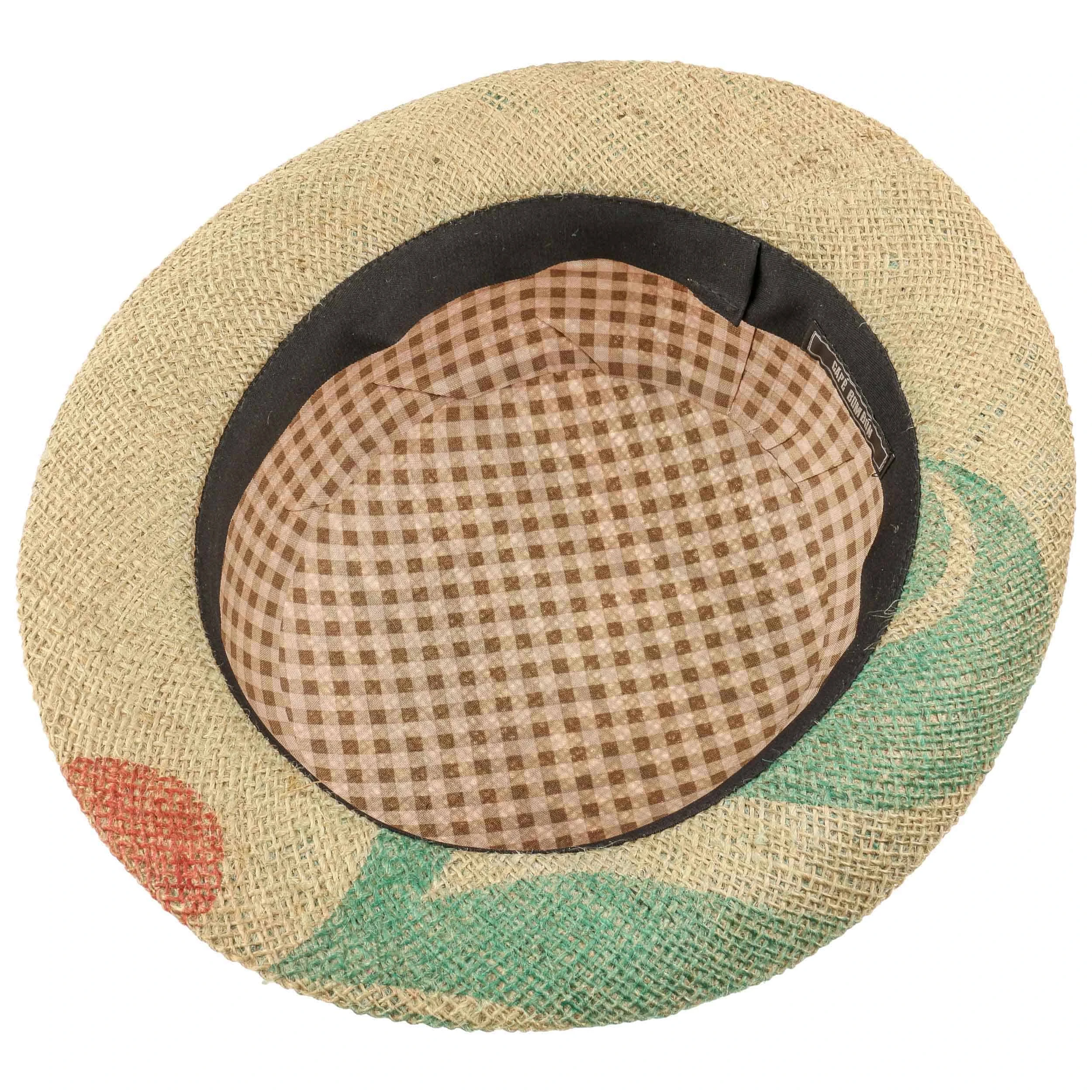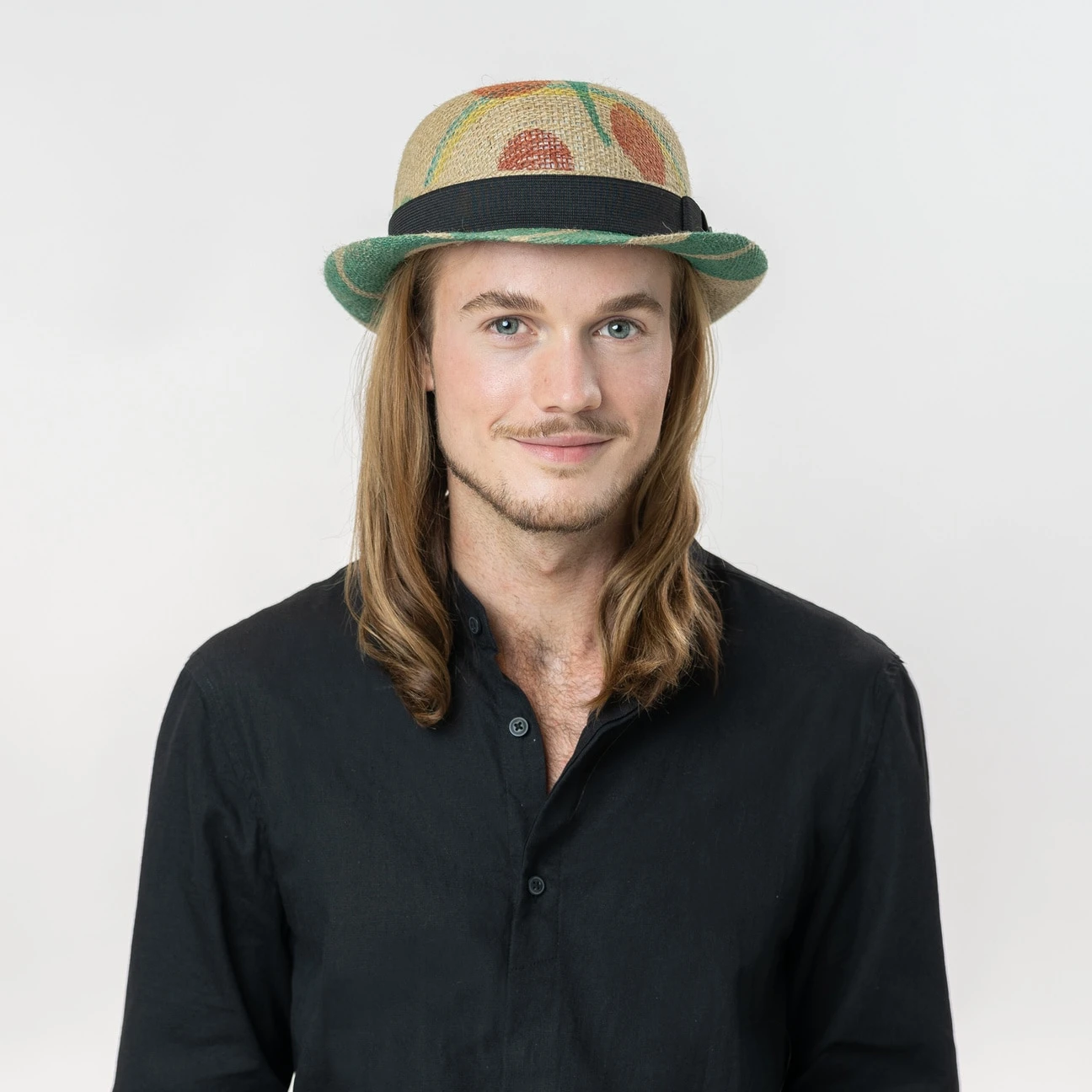 Die klassische Form einer Melone wirkt charmant und elegant, während das Material aus 100% Jute betont unbeschwert erscheint. Das Highlight des Designs ist der farbige Print, der Kopf und Krempe ziert. Große Punkte und schwungvolle Formen verleihen dem Look eine positive Ausstrahlung. Lieferung inkl. schwarzem Ripsband, das optional als Garnitur um den Hut gelegt werden kann.