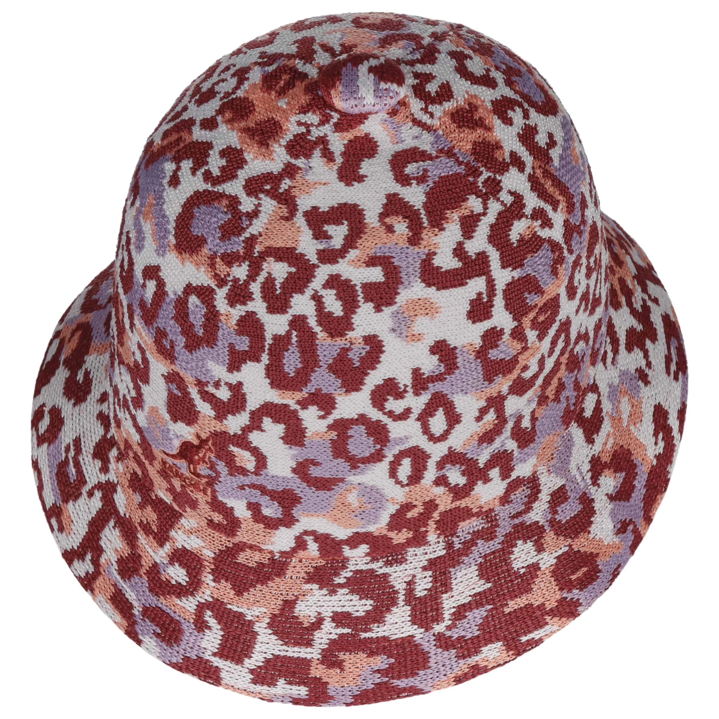 Die Blicke zieht die qualitativ hochwertige Kopfbedeckung mit tief geneigter Krempe in erster Linie mit dem ansprechend gestalteten Material, aus dem sie gefertigt ist, auf sich. Der feine Strick zeigt ein lebhaft anmutendes Leomuster, das in unterschiedlichen leuchtenden Farbtönen gehalten ist.