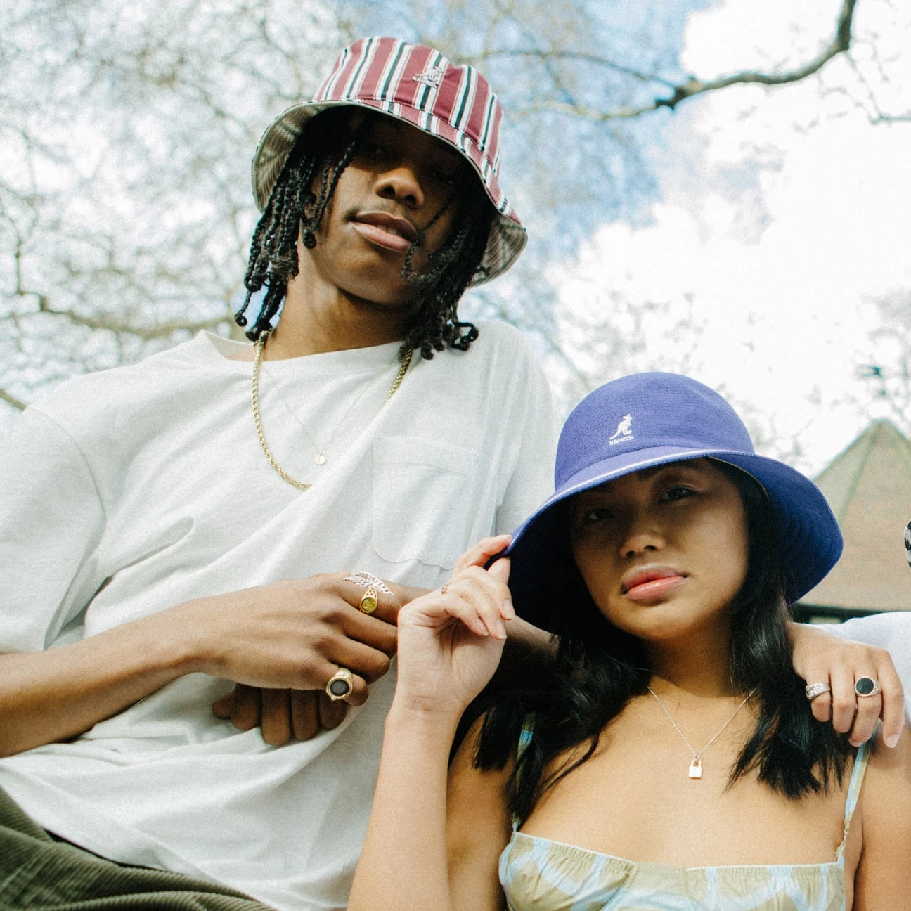 Mit dem auffälligen Allover-Muster aus farblich kontrastreich voneinander abgesetzten Streifen präsentiert sich der sportiv anmutende Bucket Hat aus dem Hause Kangol an anregender Blickfang.