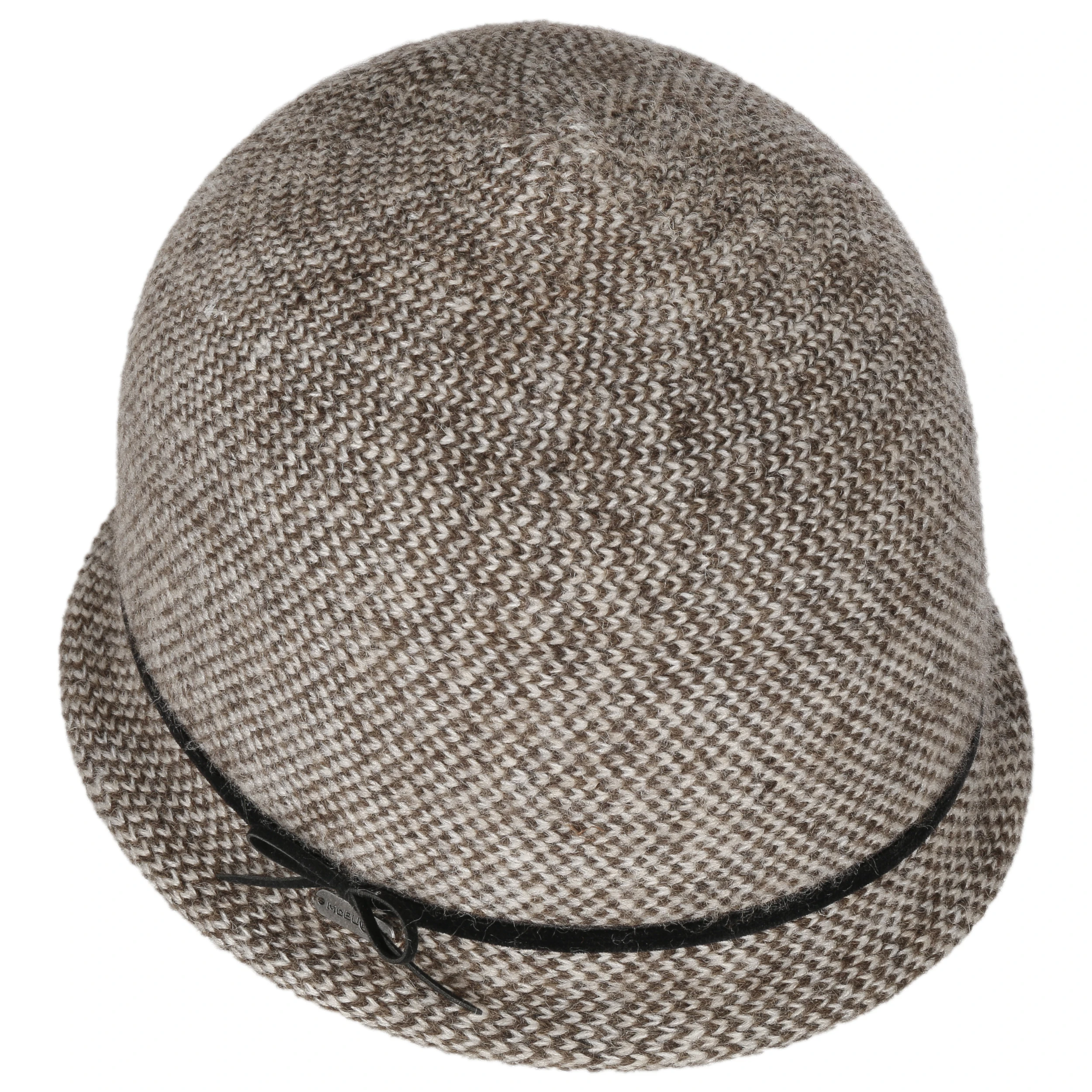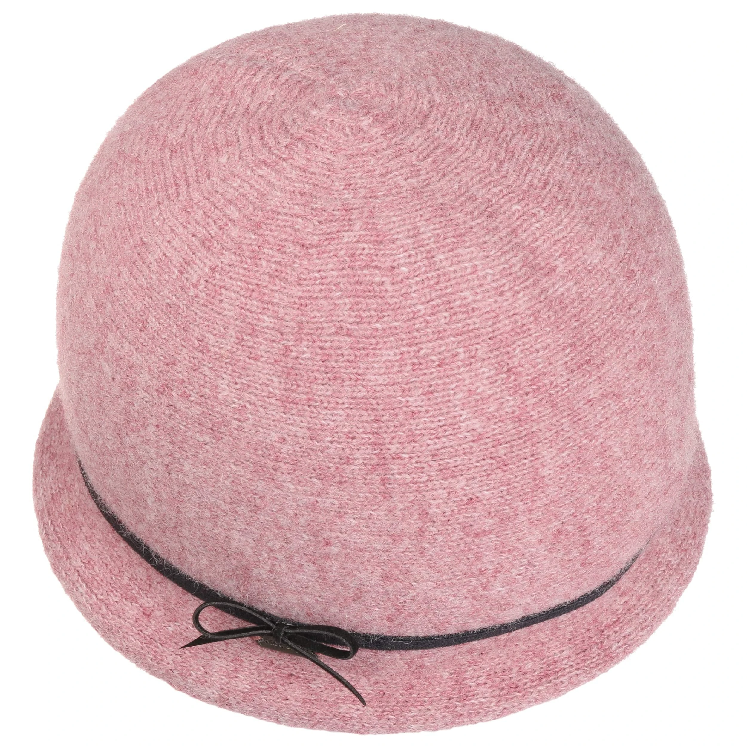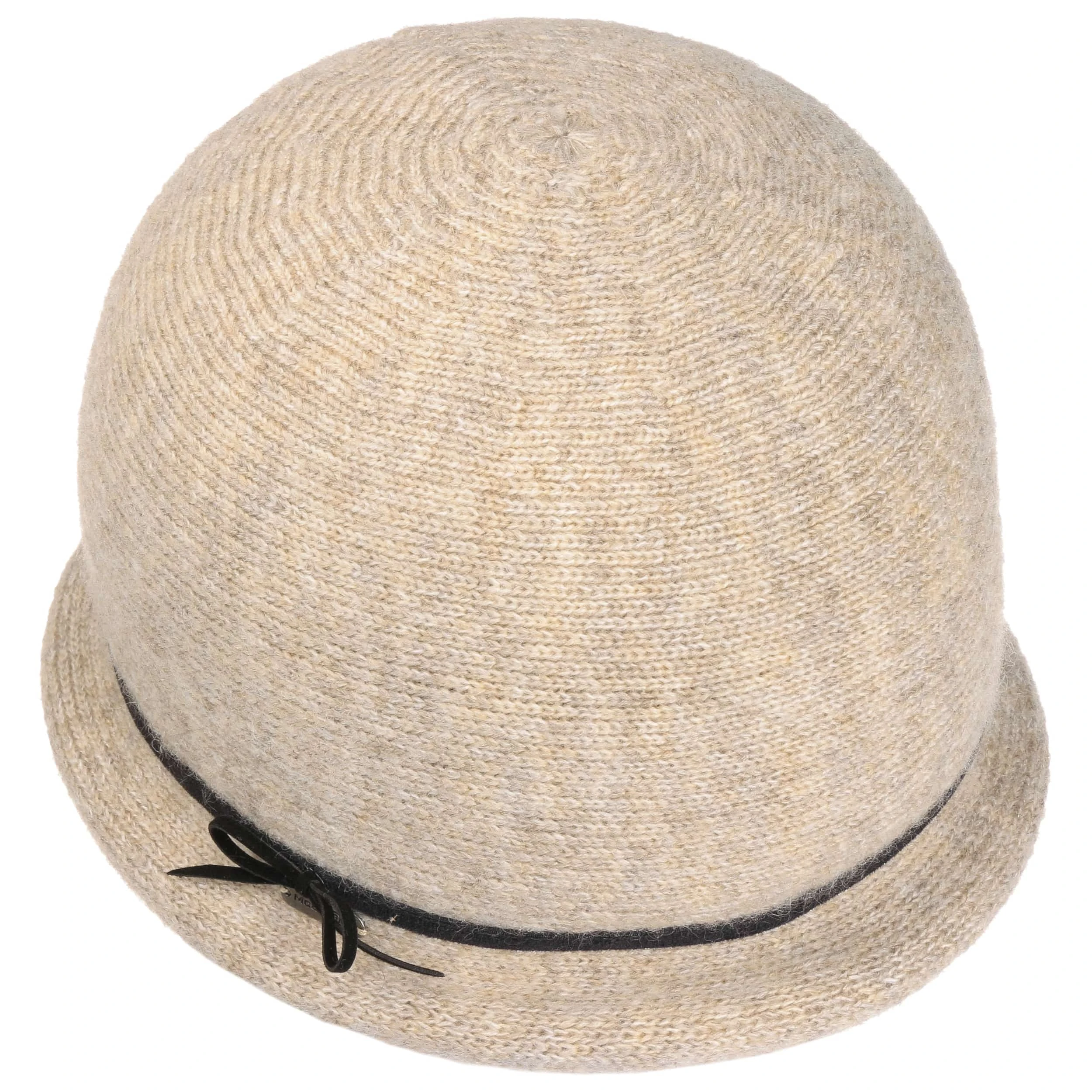 Das qualitativ hochwertige Modell präsentiert sich mit einem großen runden Kopf und einer adretten kurzen Krempe. Ein schmales Band aus farblich abgesetztem Textil im Leder-Look, das sich rund um den Kopfteil legt, schließt mit einer romantischen Schleife. Es verleiht dem Glockenhut eine anregend verspielte Leichtigkeit.