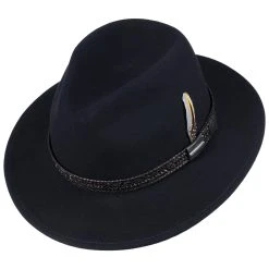 Dabei geizt der Filzhut nicht mit Komfort und ansprechenden Details: Das leichte Tragegefühl und baumwollenes Stofffutter sorgen für den bequemen Sitz, das geschmeidig unifarbene Design, eine Garnitur aus Kunstleder und der seitliche Federschmuck werden dem gehobenen Geschmack gerecht.