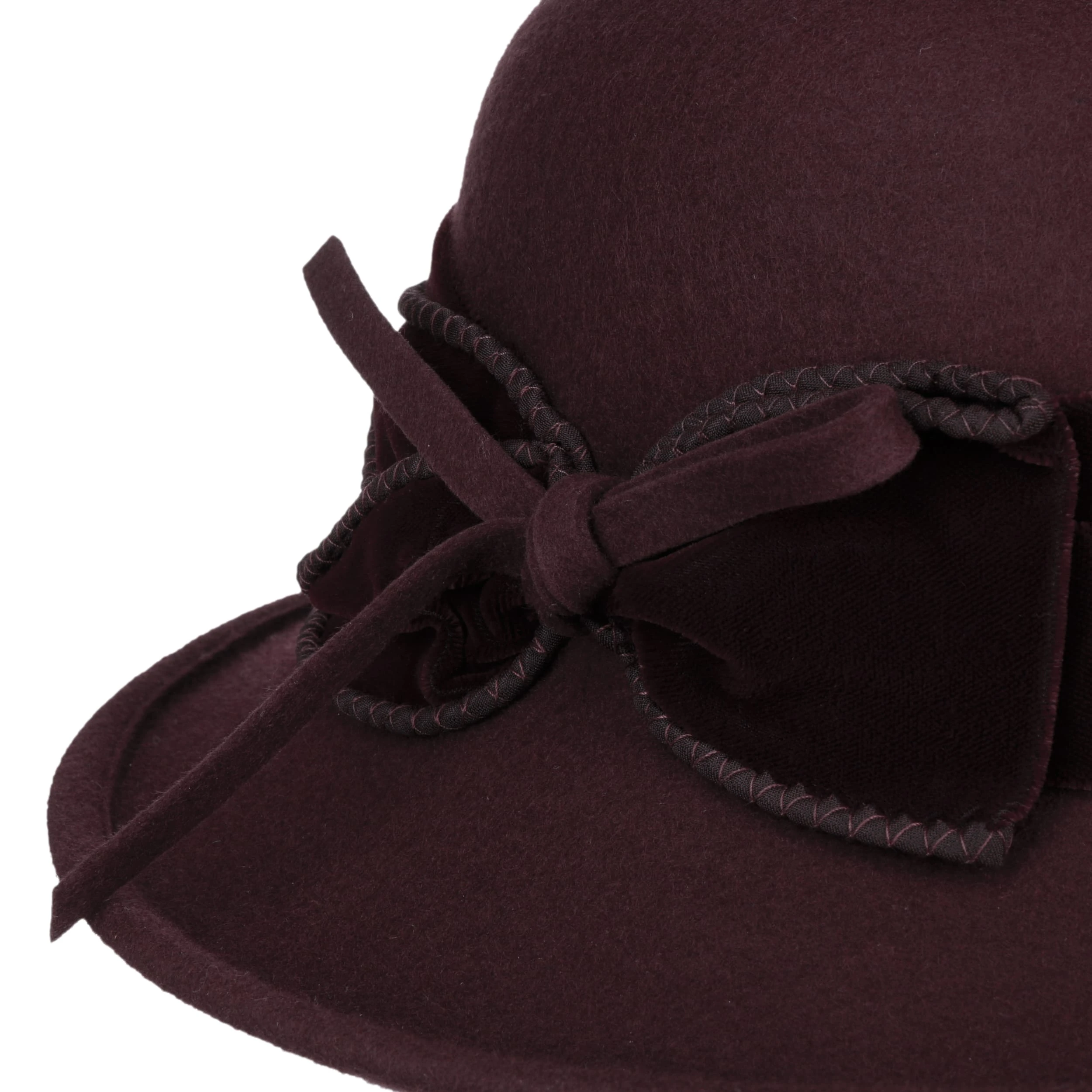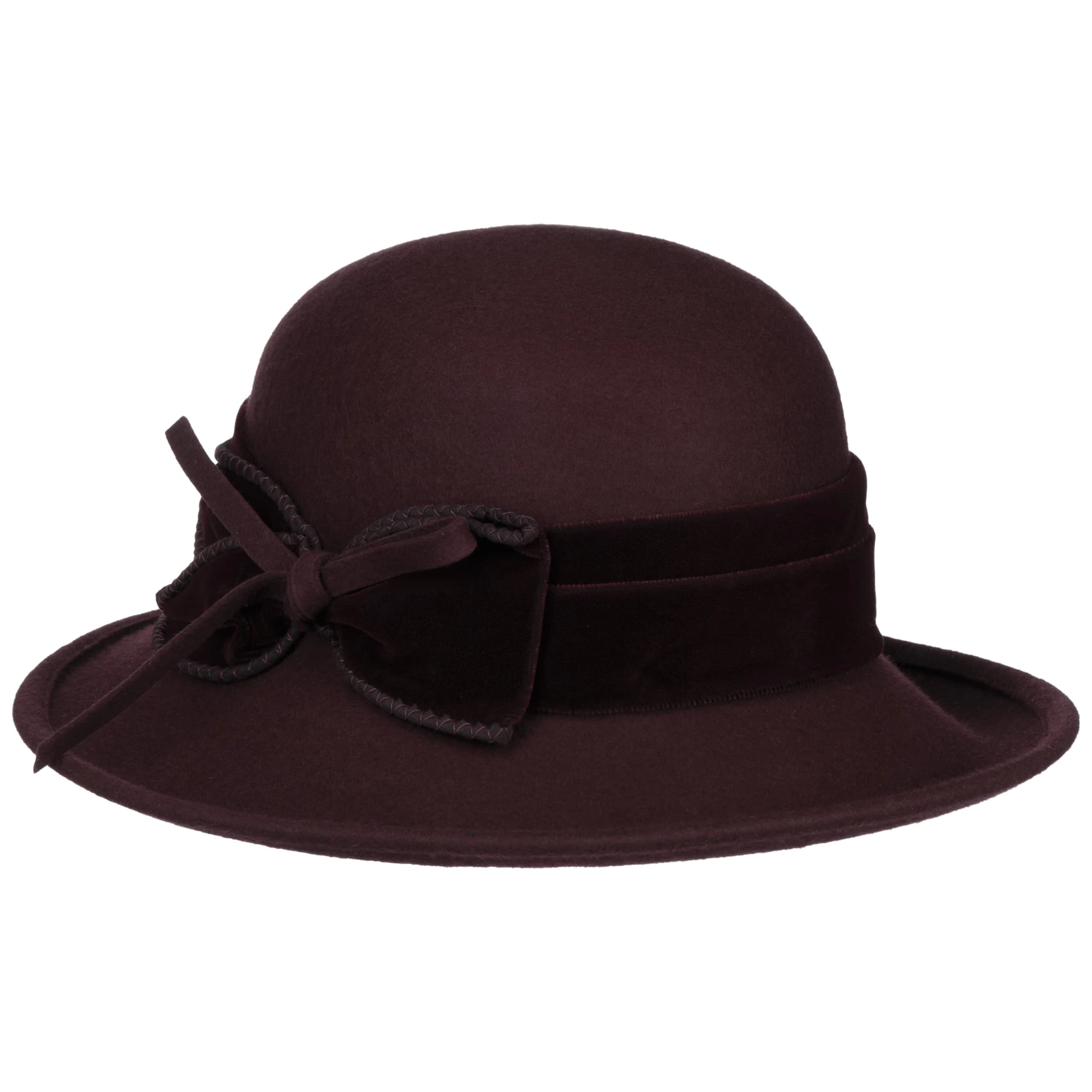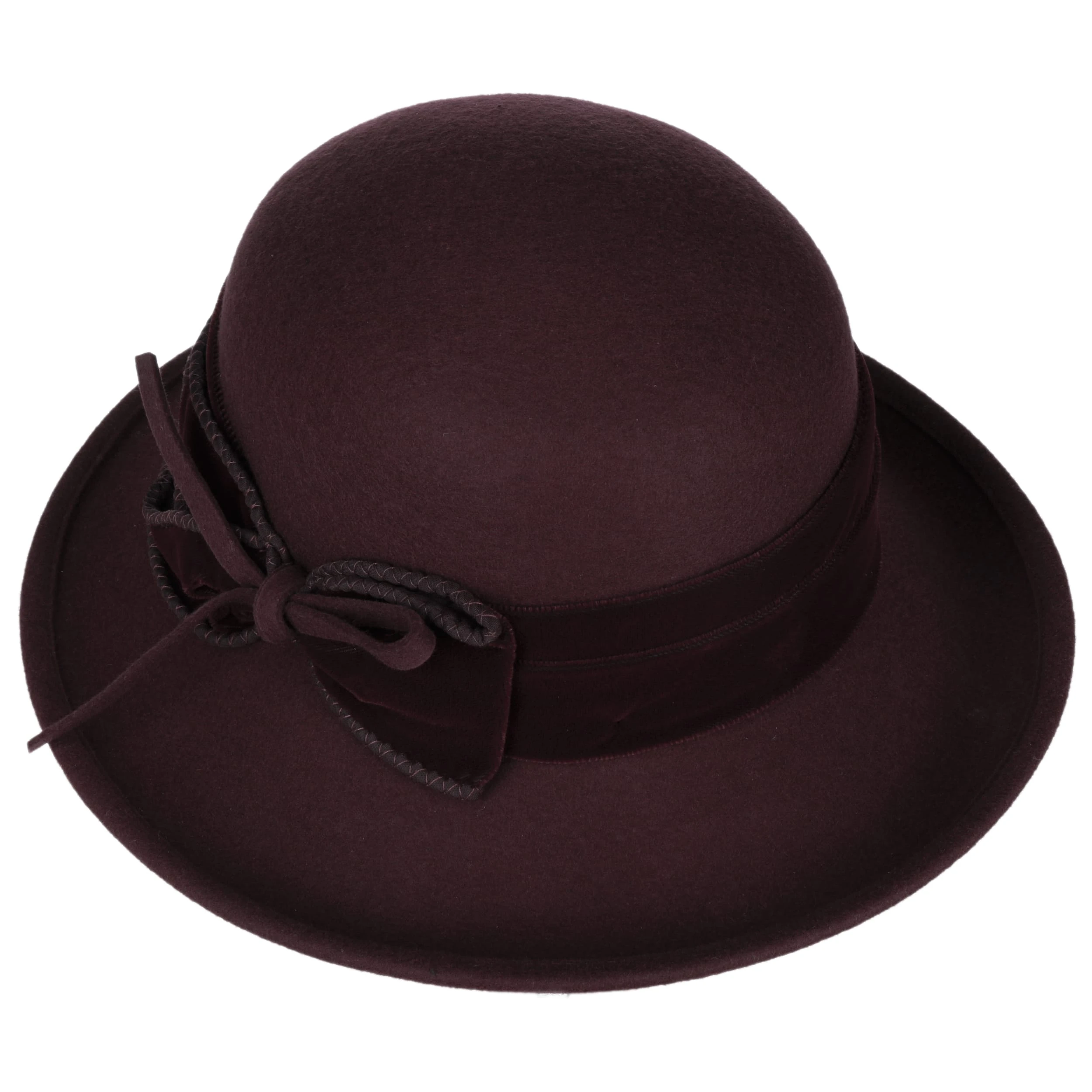 Das unifarbene Design erfährt seine stilbewusste Ergänzung durch ein Garniturband aus Stoff, seitlich dezent verspielt in einer zierenden Schleife mündend. Auf Hochzeiten und bei anderen Feierlichkeiten ist der Filzhut ein gern gesehener Begleiter der modebewussten Dame.