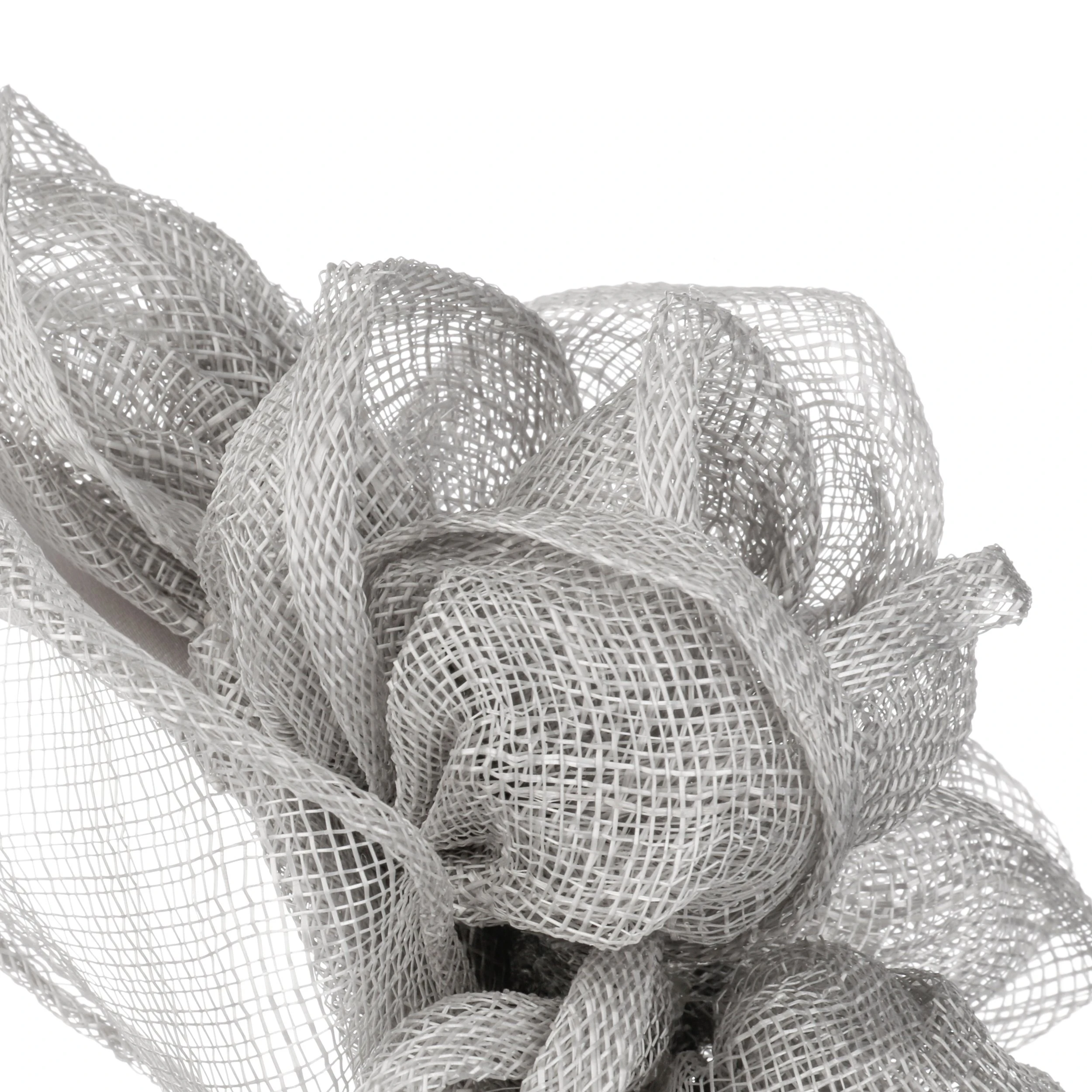 Seine seitlich auf einem schmalen Reif platzierte Applikation zeigt sich in Form einer geöffneten Blüte. Zwei Elemente, die an Blütenblätter erinnern, legen sich sacht über das Haar – romantisch und sommerlich. Das grobmaschige Geflecht verleiht dem Design eine unbeschwerte Note.