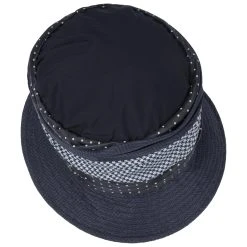 So erweist sich das Modell als praktischer Begleiter für Outdooraktivitäten an grauen Übergangstagen. Optisch überzeugt der in Italien hergestellte Stoffhut mit seinem auffällig breiten, in Falten gelegten Garniturband. Hier zeigt jede Stoffschicht ein anderes zweifarbiges Muster.