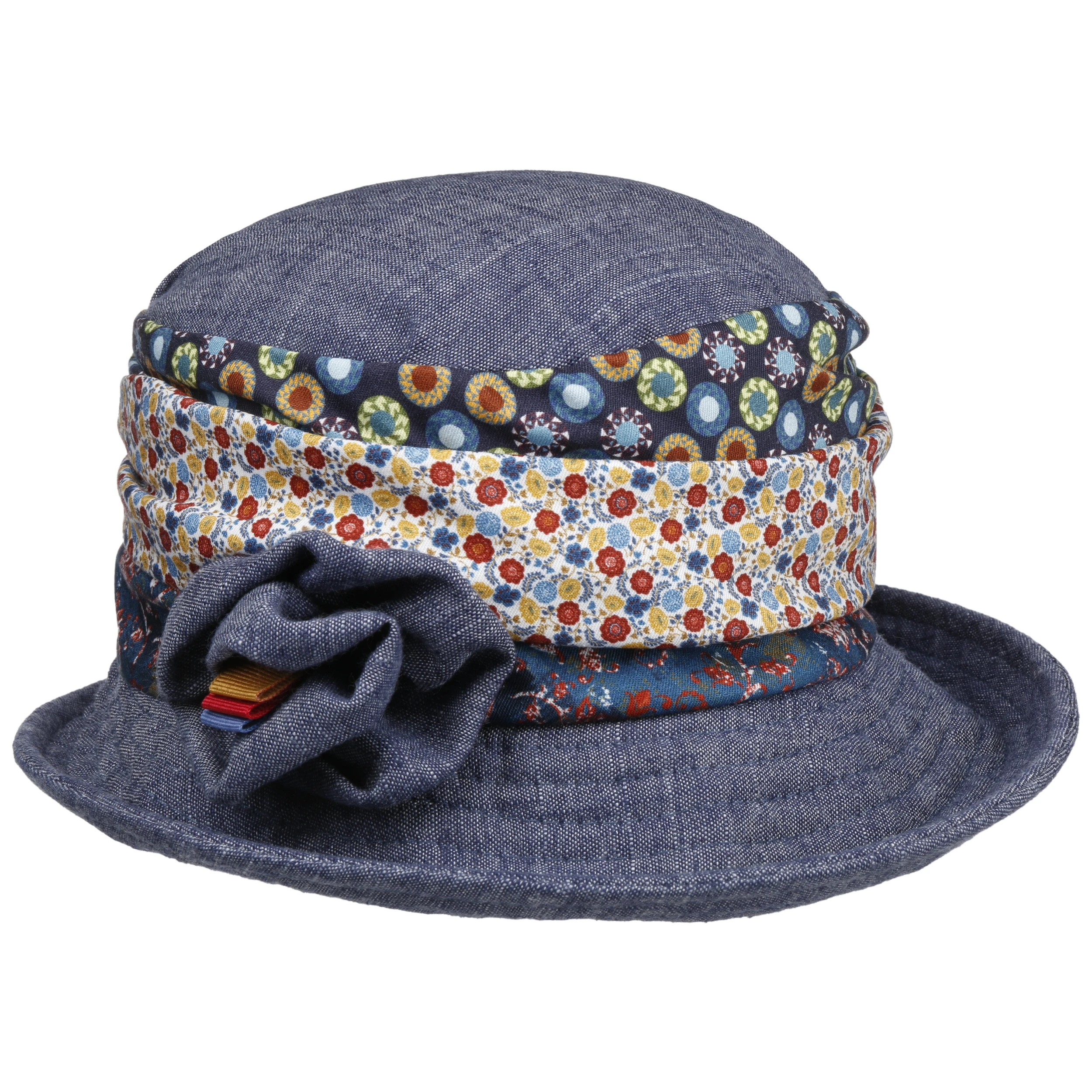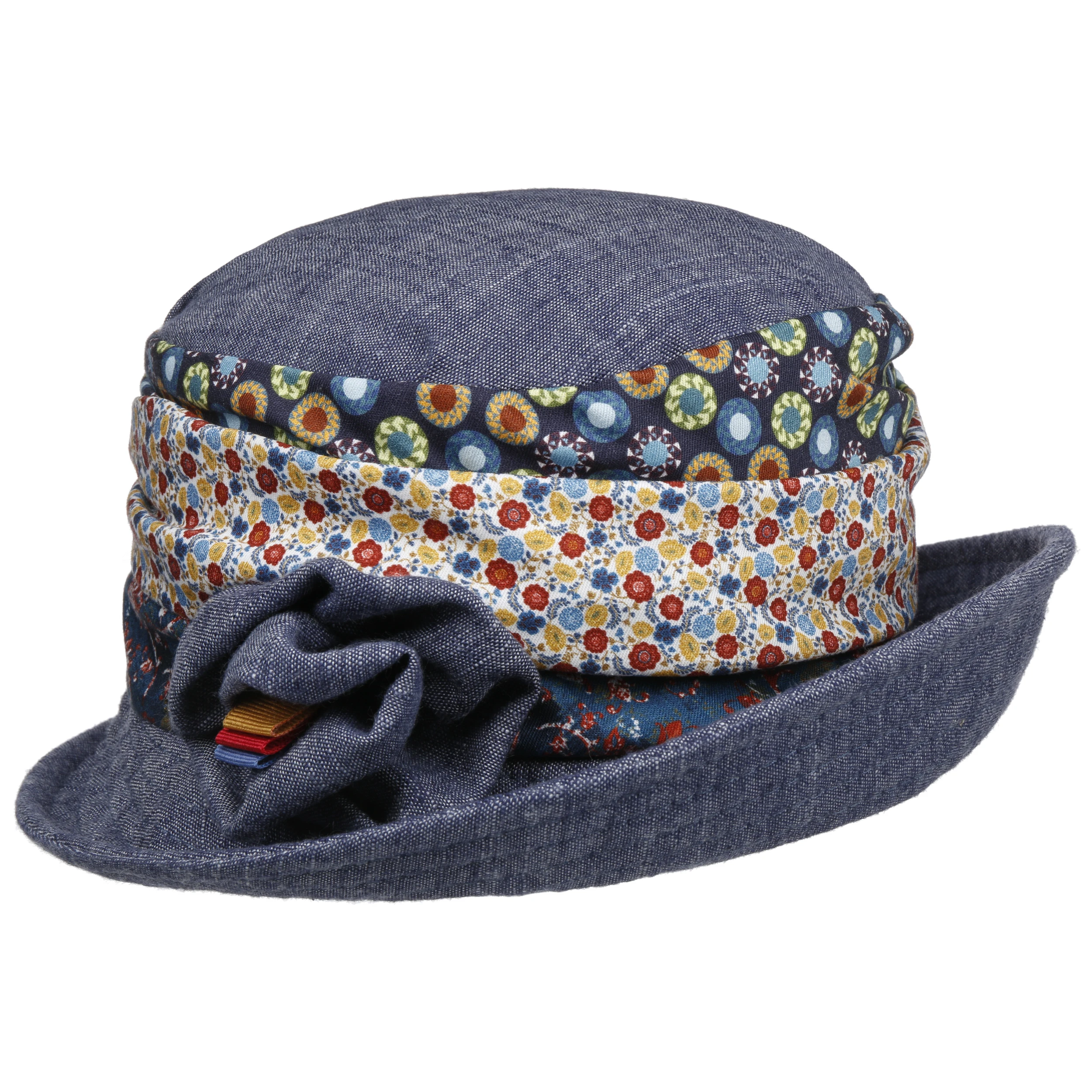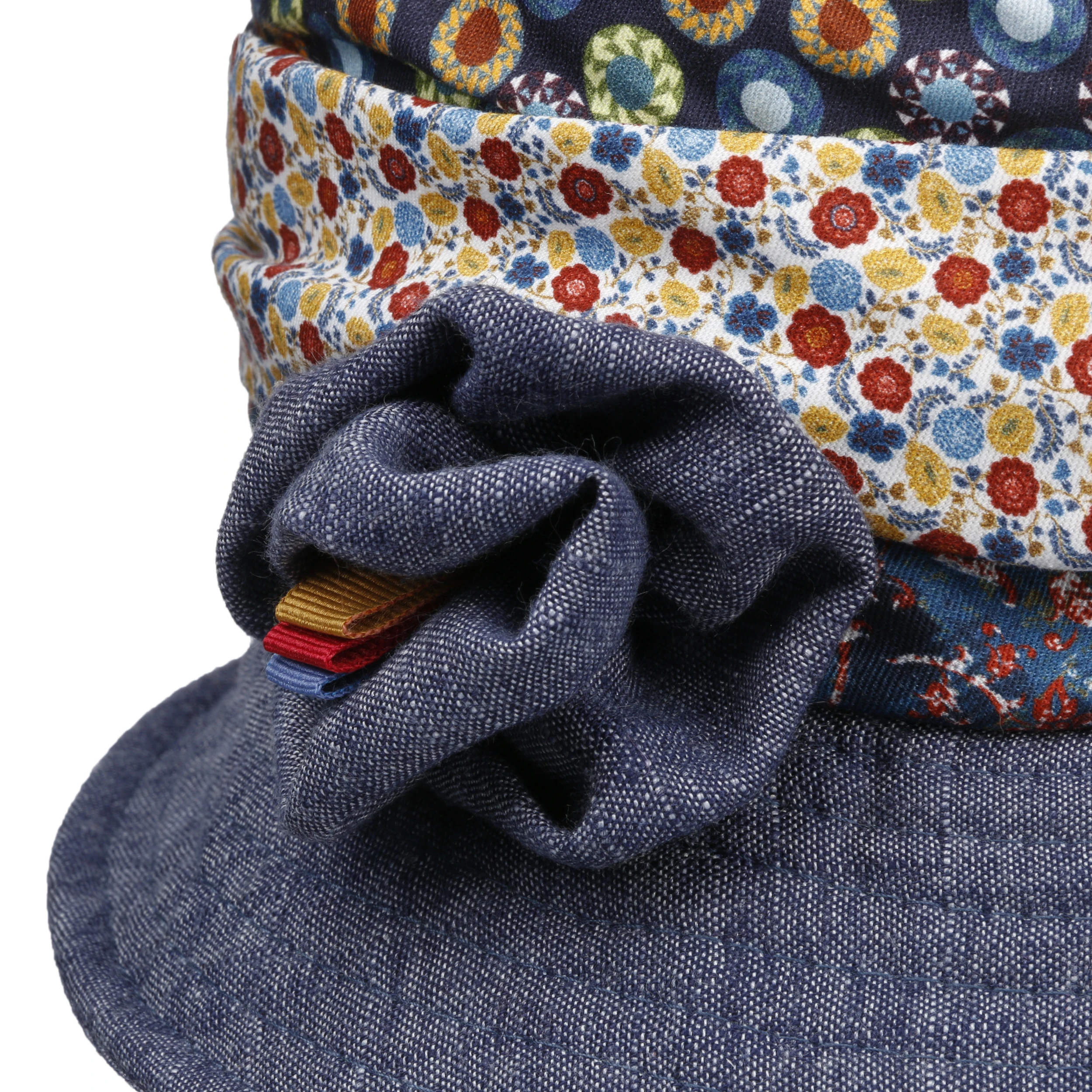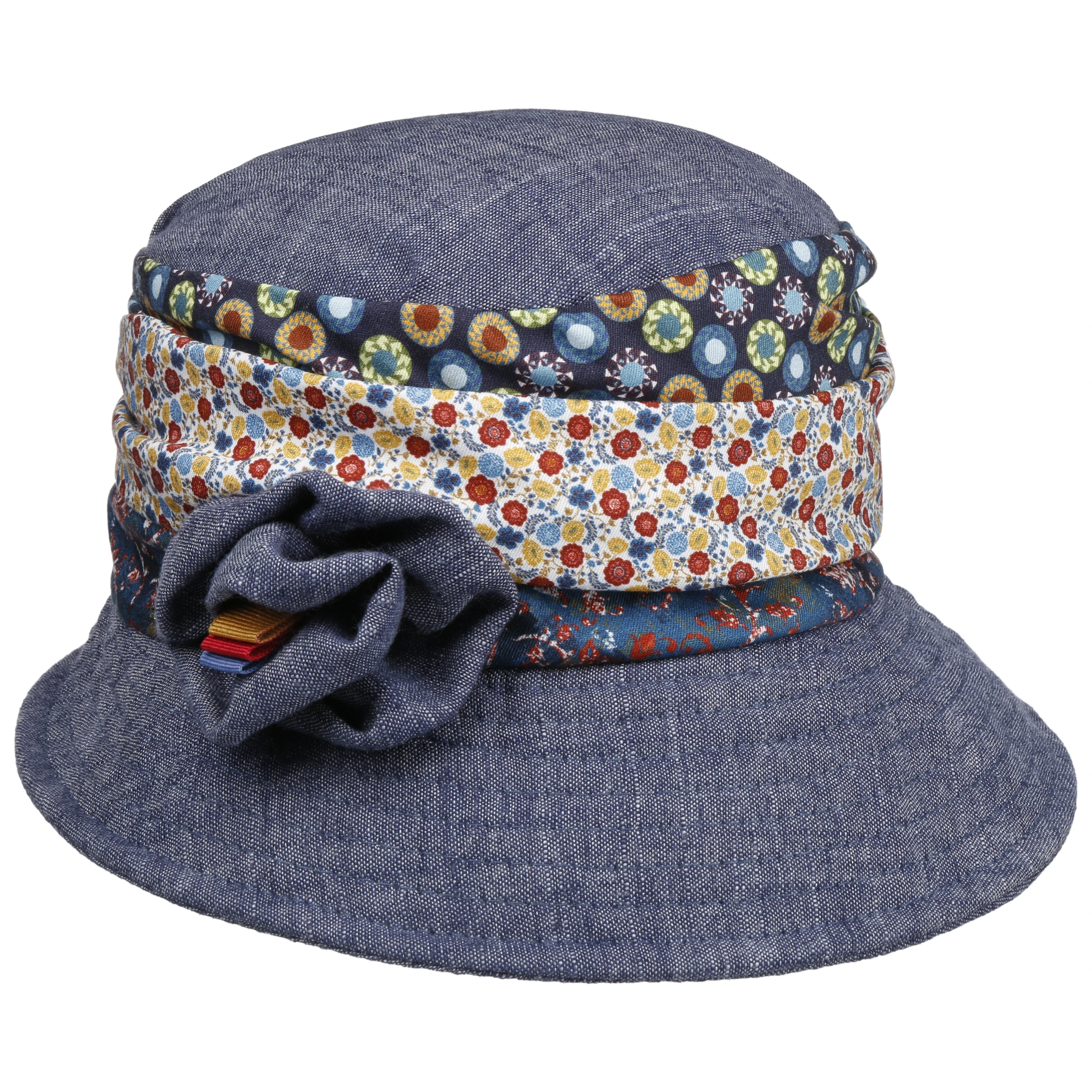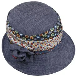 Griffige Baumwolle im angesagten melierten Denim-Look erfährt seine Ergänzung durch eine breite Garnitur, über und über mit Blüten versehen, sowie einer dekorativen seitlichen Blütenapplikation: Der Stoffhut der Marke Lierys Gold ist optisch ganz auf Sommer eingestellt und wartet mit komfortablem Baumwollfutter auf, das den Kopf an warmen Tagen mit seiner guten Feuchtigkeitsaufnahme verwöhnt.