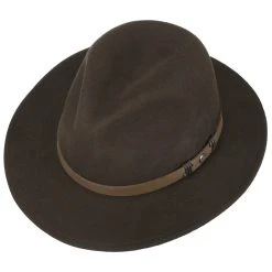 Kein Wunder also, dass die qualitativ hochwertige Kopfbedeckung in den USA hergestellt wurde. Neben der typischen Form mit breiter Krempe und tiefen Kniffen sind es das sorgfältig verarbeitete Filzmaterial und das Garniturband aus Leder, die die authentische Ausstrahlung des Hutes prägen.