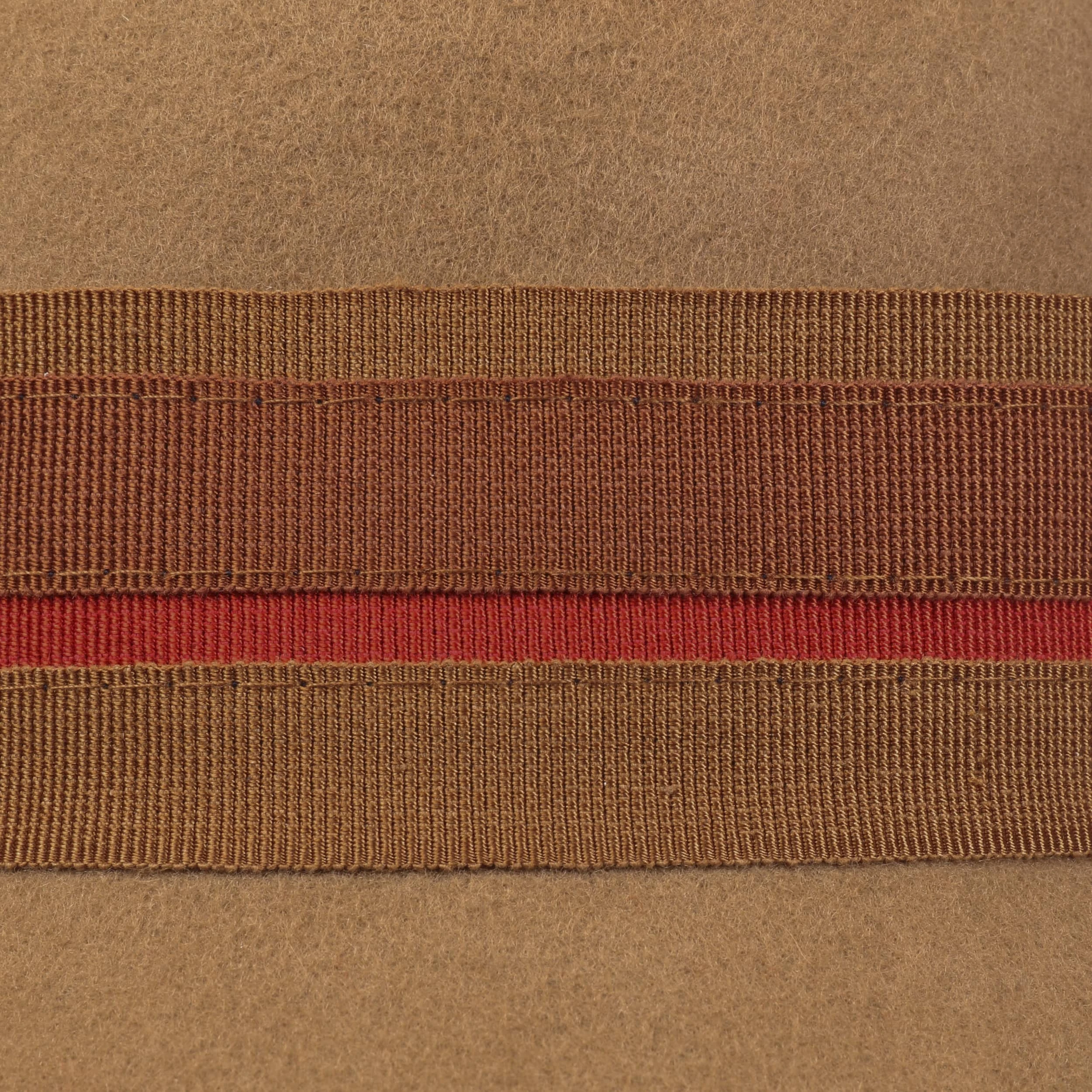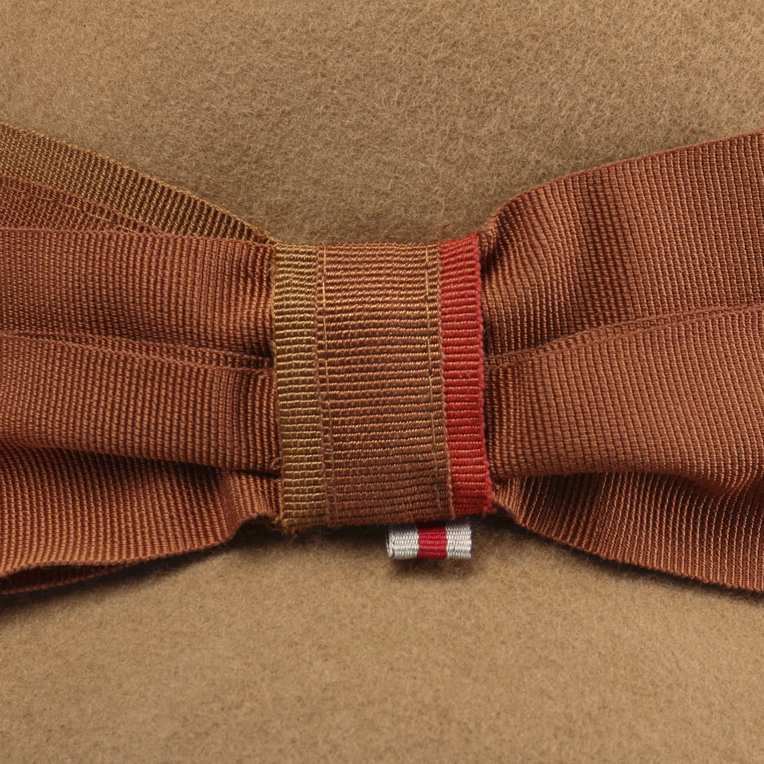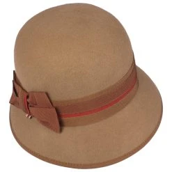 Für seinen schwungvollen Eindruck sorgt insbesondere die asymmetrische, frontal verlängerte Krempe, die tief nach unten geneigt und leicht gewölbt ist. Auch die große Schleife, die auf einem breiten mehrfarbigen Ripsband sitzt, wirkt lebhaft und anregend. Mit dem Filz aus 100% Wolle bietet die Glocke traditionellen Wetterschutz.