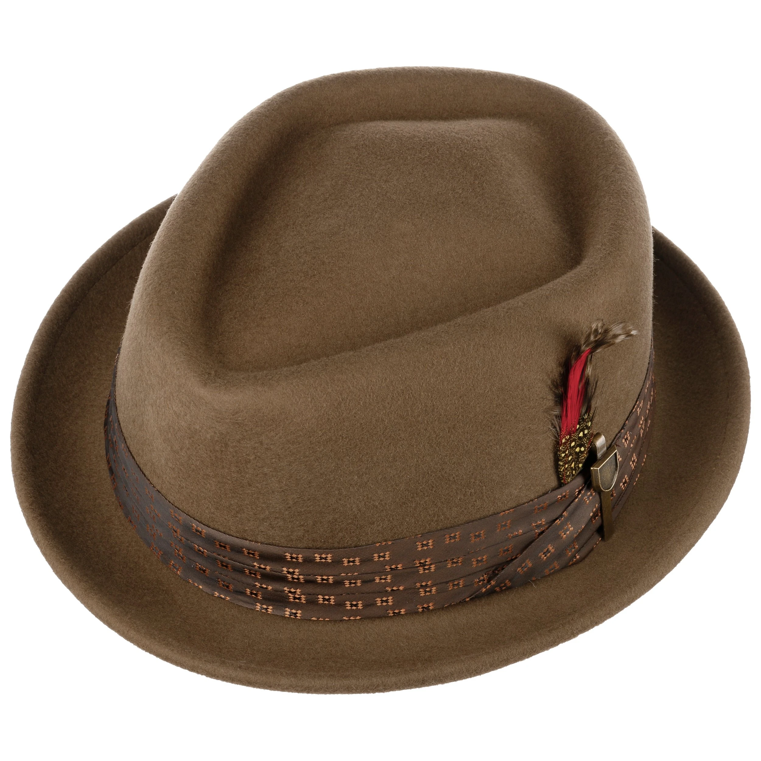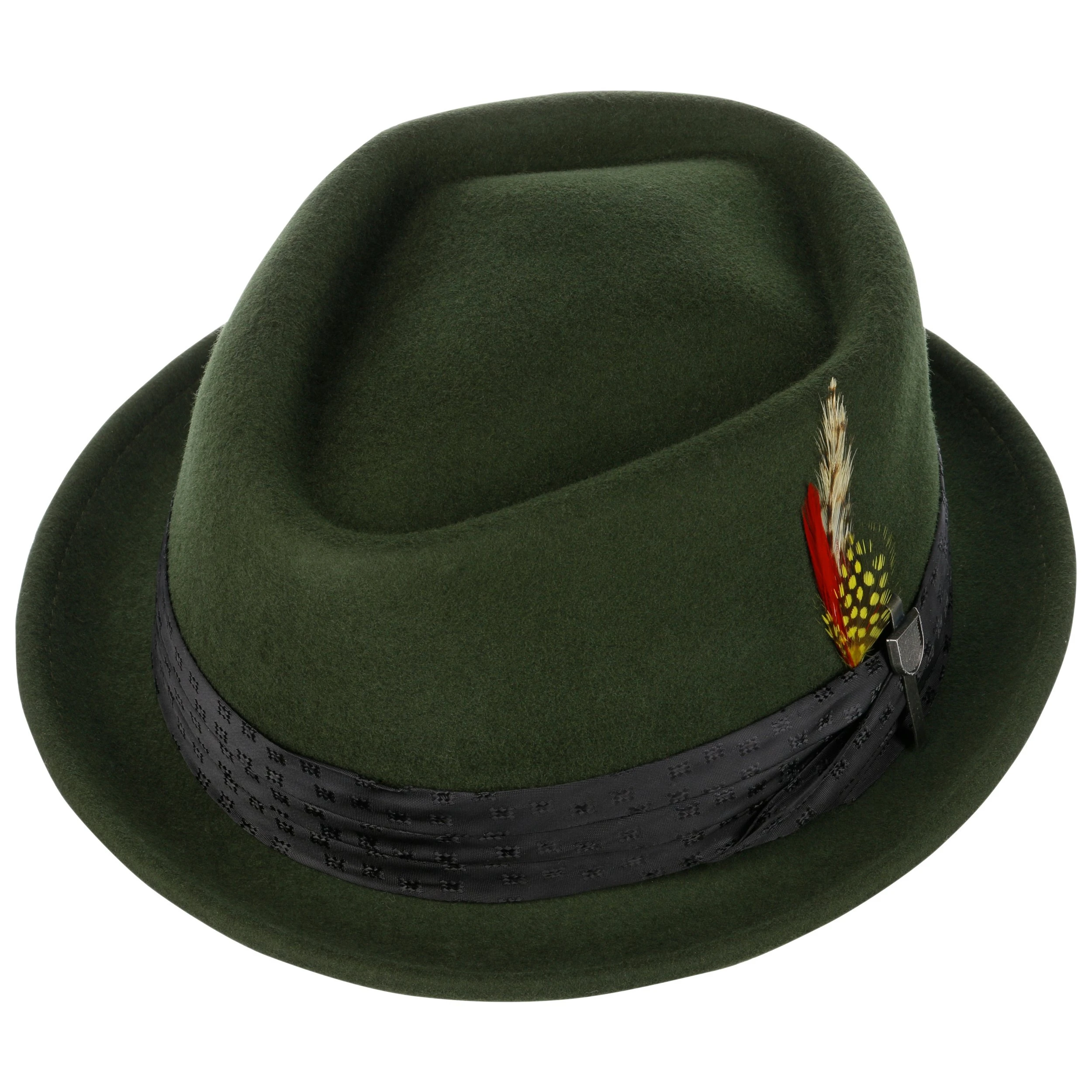 Ihrerseits bietet die Garnitur dem seitlichen Federschmuck Halt, der den Filzhut gekonnt vollendet.