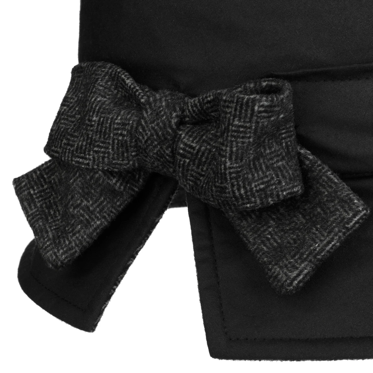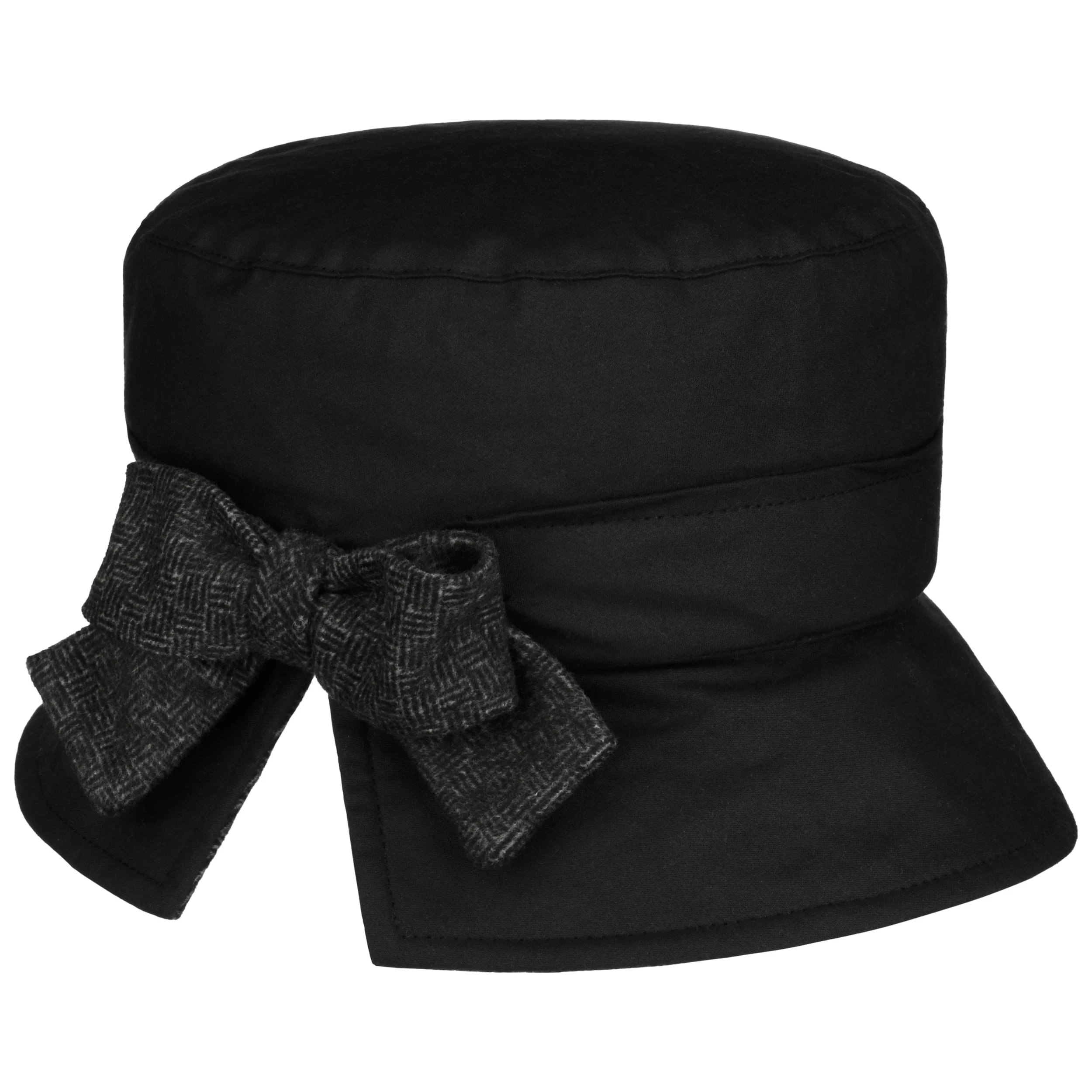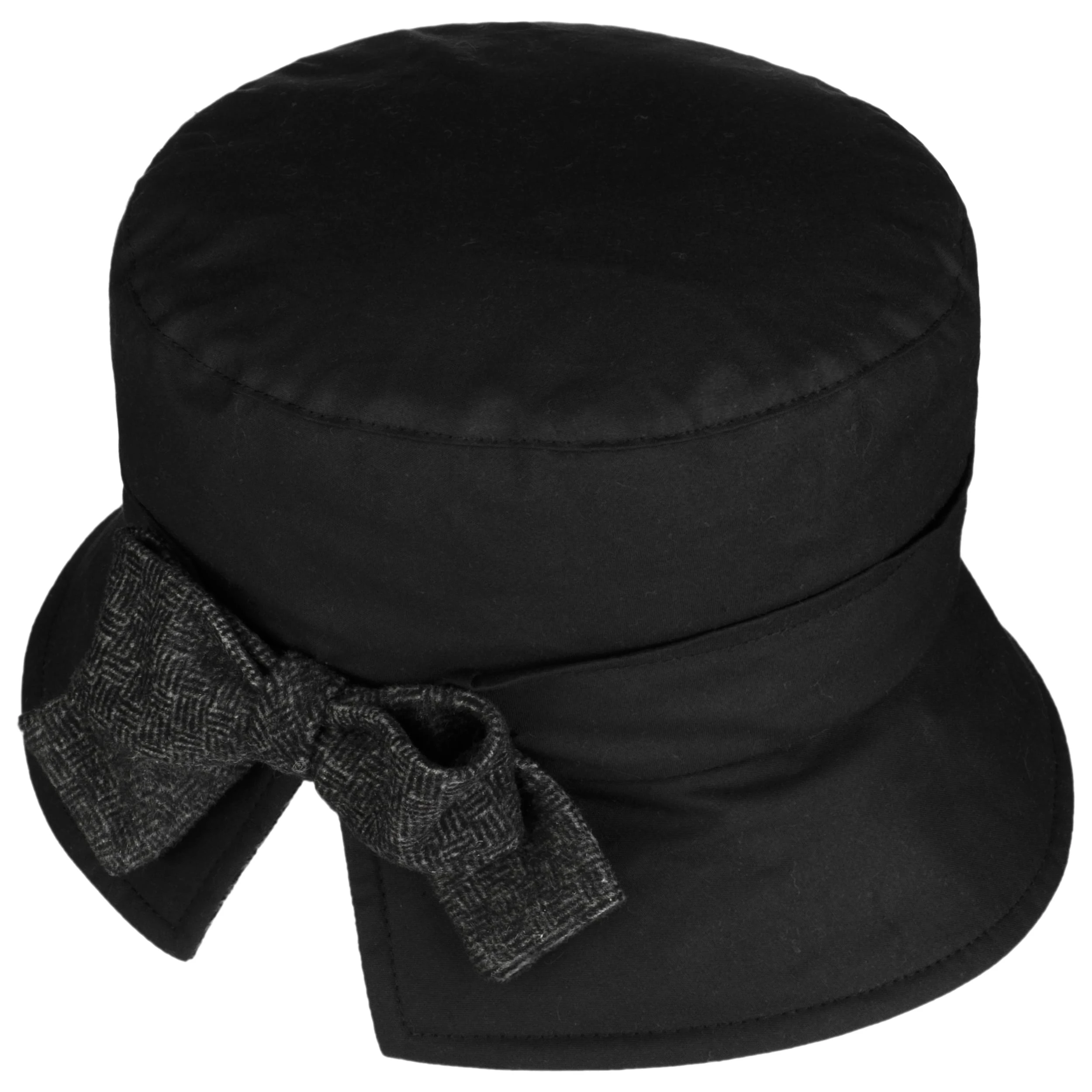 Der Glockenhut ist aus gewachster Baumwolle mit Wollanteil gefertigt und wasserabweisend. Eine breite Krempe schützt Gesicht und Nacken. Am Hinterkopf ist eine opulente Schleife mit Fischgrätmuster angebracht, die dem sportiven Design einen verspielten Touch verleiht. Dadurch eignet sich der Regenhut zum Wandern im Sommer ebenso wie zur Grillparty oder dem Biergartenbesuch.